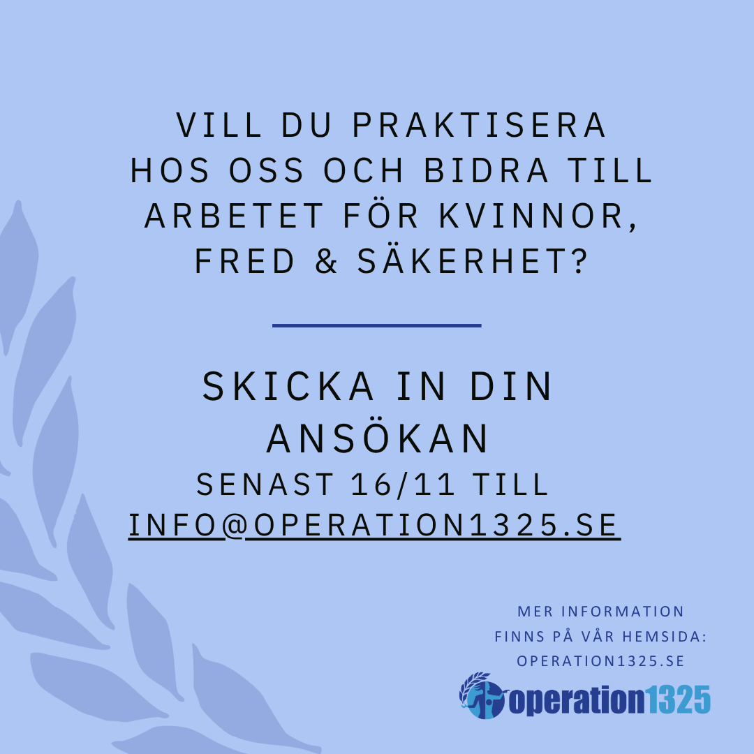 Operation 1325 söker en praktikant för våren 2026 Plats: Södermalm, Stockholm Praktikperiod: VT2026. Ca 20 veckor. Arbetstid: ~ 09.00-17.00 mån-fre. Kvälls- & helgarbete kan förekomma Möjlighet till distansarbete: Kansliet arbetar hemifrån ca två dagar...